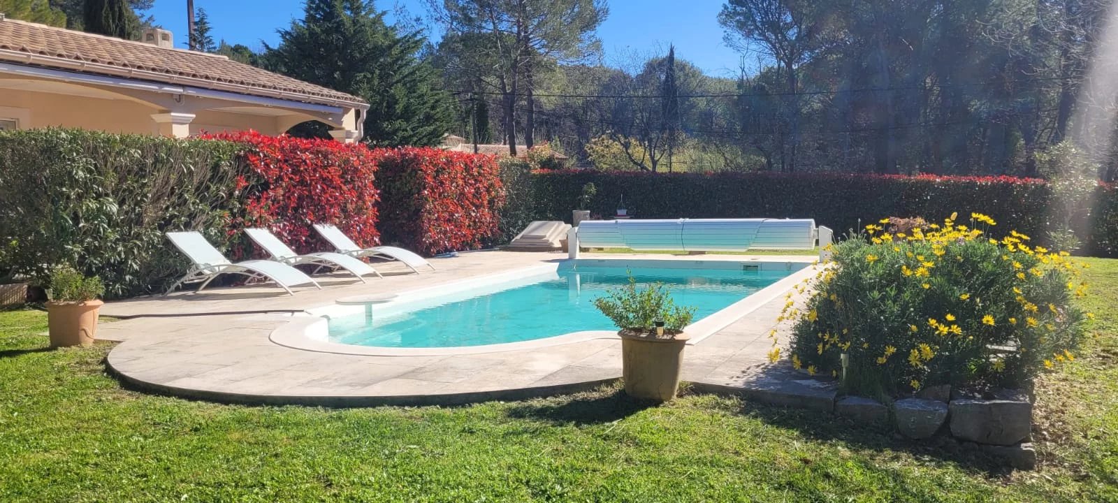 Un bel espace piscine avec plusieurs terrasses. Villa traversante lumineuse et fonctionnelle avec son plancher chauffant, sa climatisation réversible et son accès facile. Fosse septique aux normes.